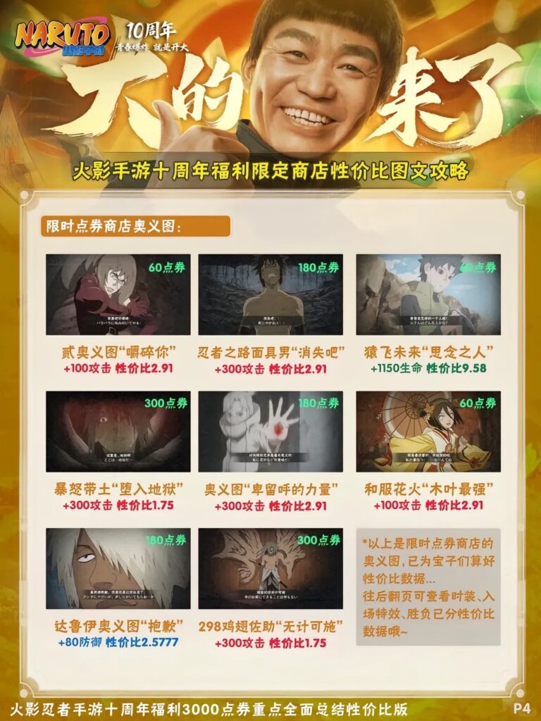 《火影忍者手游》十周年庆典从11月16日开启,包含首波S忍获取、周年庆邀请赛、庆典高潮及线下盛典,持续至明年1月底,联动王宝强和迈特·凯,推出限定A忍和福利,免费s忍,免费时装福利。