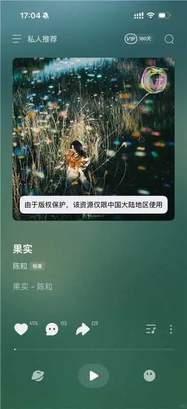 - 当汽水音乐服务器检测到一个来自海外(非中国大陆)的IP地址发起访问时,会根据授权协议强制拒绝该请求,并显示“版权限制”等提示信息。