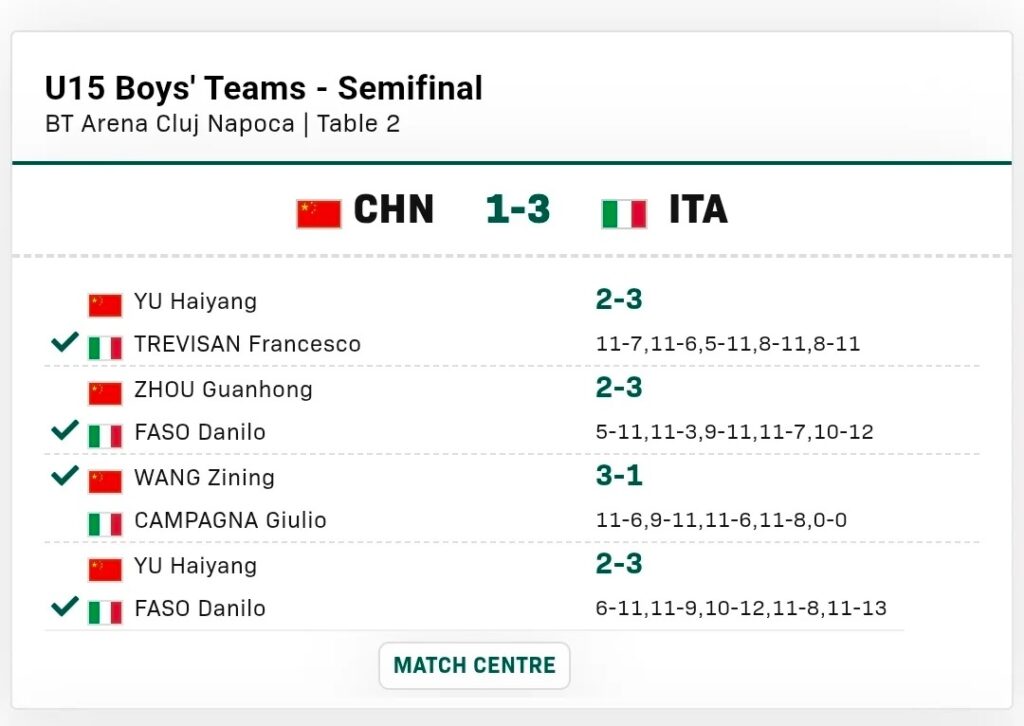 - U15 男团:半决赛 1-3 爆冷不敌意大利队,爆出本届赛事最大冷门,季军战将对阵韩国队;