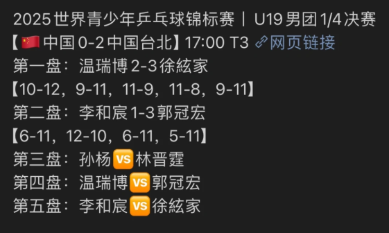 - 第二盘:新星李和宸迎战郭冠宏,虽扳回一局但未能守住优势,1-3 落败,国乒 0-2 陷入绝境;