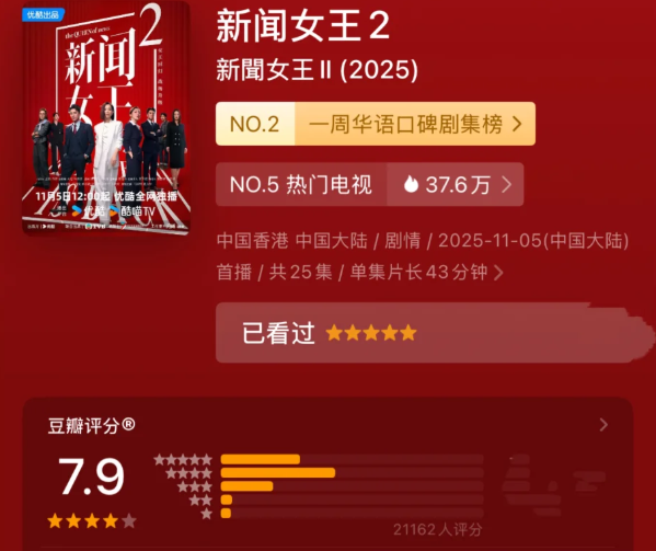 数据不会说谎:《新闻女王2》11月5日在优酷独播后,平台热度迅速突破8200,香港地区最高收视达20.9点(覆盖135万观众),登顶当地收视榜;豆瓣开分7.9,虽略低于开播初期的8.5分,但仍远超同期其他剧集,位列豆瓣实时热门电视榜第五,评分人数超两万。商业层面更是创下港剧历史纪录——30+品牌合作,广告总收入突破港剧天花板,站内预约量早在开播前就突破150万,预告片海外播放量更是高达3.69亿次。