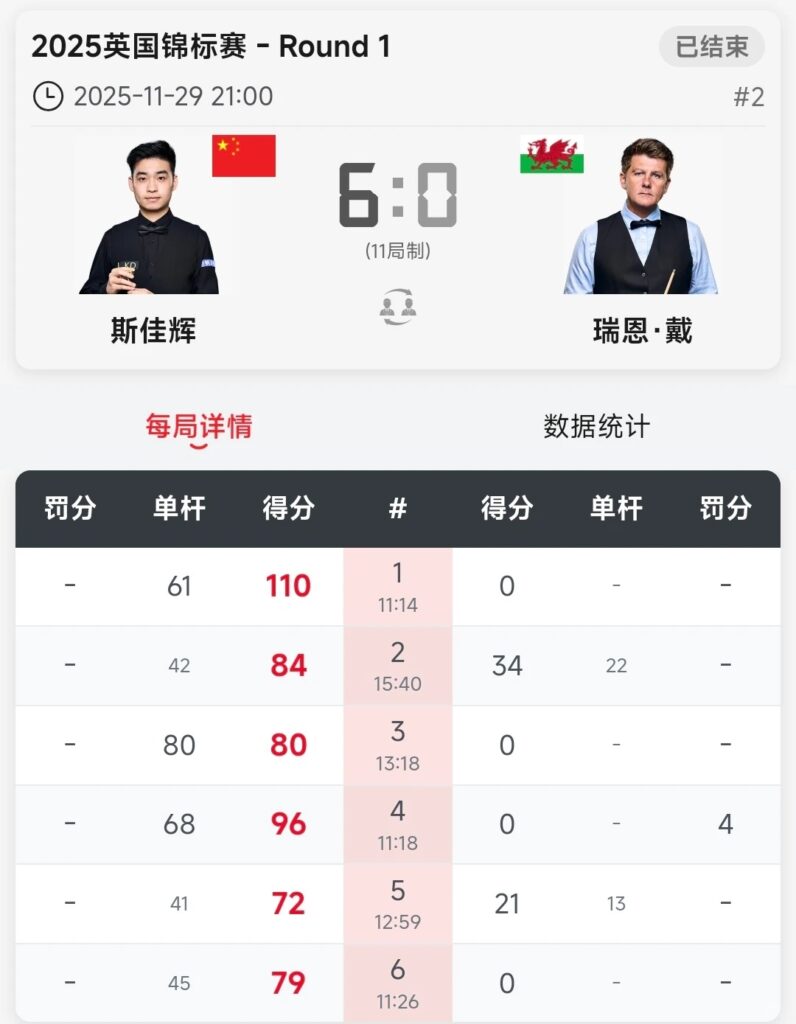 中国军团的开门红则由斯佳辉稳稳拿下。这位00后超新星对阵手握4个排名赛冠军的威尔士名将瑞恩·戴时,展现出碾压级的统治力,全程几乎没有给对手任何调整机会,以6-0的悬殊比分横扫晋级。比赛中,斯佳辉首局就以单杆61分零封对手,随后又凭借单杆80分、68分的精彩表现扩大优势,最终轻松锁定16强席位。不过稍显遗憾的是,另一位中国选手吕昊天未能延续资格赛的火热状态,在与大满贯得主肖恩·墨菲的较量中,尽管前三局取得2-1领先,但后续被对手连续打出单杆50+连扳五局,最终以2-6落败,无缘次轮。