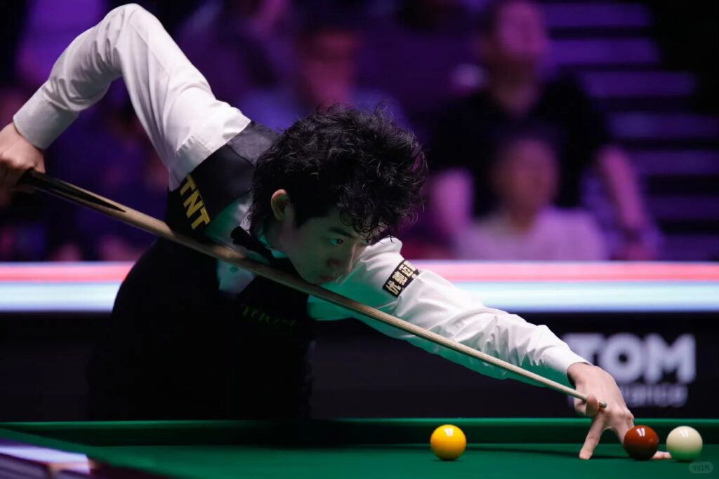 作为本届赛事的最大看点之一,中国军团的表现始终牵动着球迷的心。在已结束的5场中国选手出战的比赛中,3人成功突围,展现出新生代与中生代的双重活力。其中最令人惊喜的莫过于00后小将庞俊旭的爆冷胜利——在一场中国德比中,从资格赛一路过关斩将的他,以6-2击败赛会12号种子、武汉公开赛卫冕冠军肖国栋,后者也成为本届赛事首位出局的TOP16选手。这场较量中,庞俊旭展现出与年龄不符的沉稳,凭借标志性的“磨控”打法早早取得3-0领先,尽管肖国栋在第四、五局连续轰出单杆101分和104分的破百表现展开反扑,但庞俊旭迅速稳住阵脚再下三局,最终锁定晋级名额。