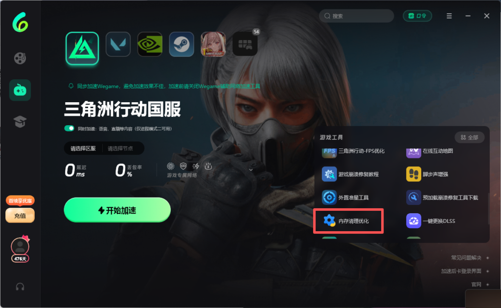 2..打开sixfast回国加速《三角洲行动》 → 使用右侧的“内存清理优化”,清一遍缓存。