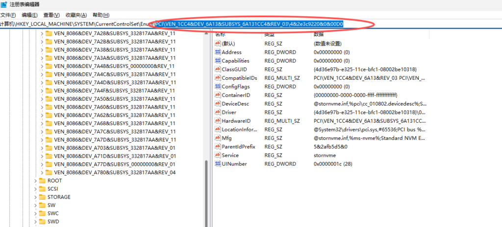 在注册表编辑器找到下面的路径,将此路径粘贴到注册表对应位置的 Enum 后,回车。