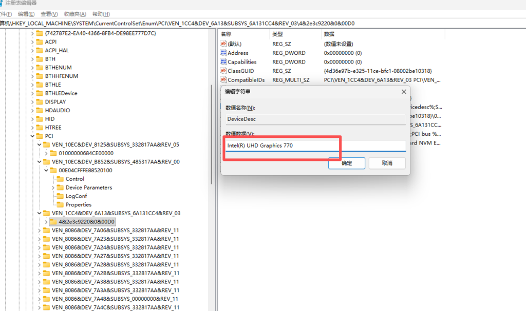 找到字段 DeviceDesc把显卡型号改成任意低端型号