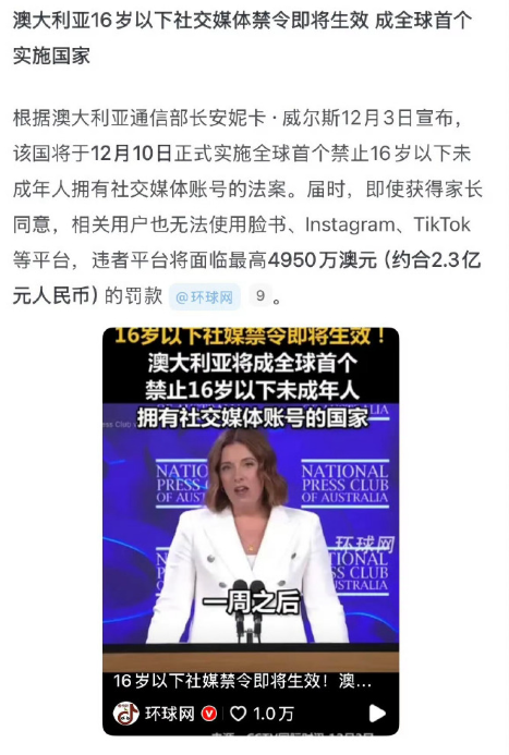 - 澳大利亚全面禁止16岁以下人群(含游客、留学生)使用社交媒体