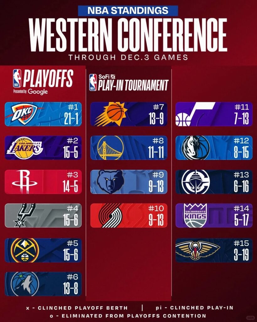 12场比赛结束后,NBA东西部积分榜迎来大洗牌,其中西部的竞争堪称“白热化”,前七名球队之间的分差极小,稍有不慎就可能掉出季后赛区。