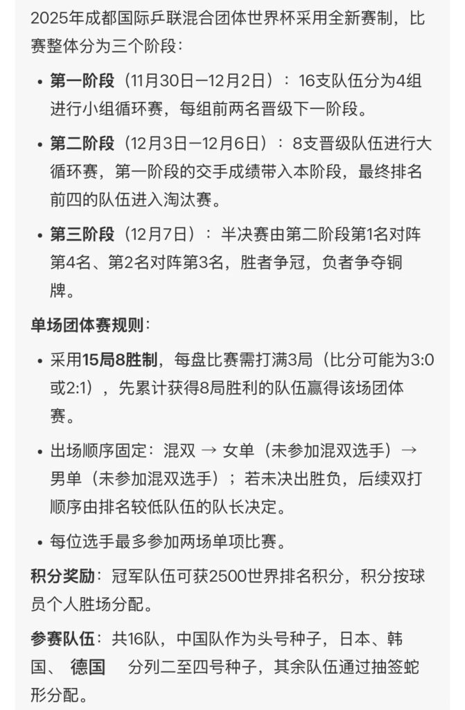 乒乓球迷速看!2025成都混团世界杯半决赛焦点战已火热开打!北京时间今早10点,中国队与老对手韩国队在四川省体育馆狭路相逢,这场对决不仅关乎决赛门票归属,更直接影响洛杉矶奥运会积分的分配,每一局较量都牵动人心。目前比赛正进行到关键阶段,国乒首发阵容暗藏玄机,韩国队则携复仇之心全力反扑,这份实时聚焦指南带你直击赛场核心看点!