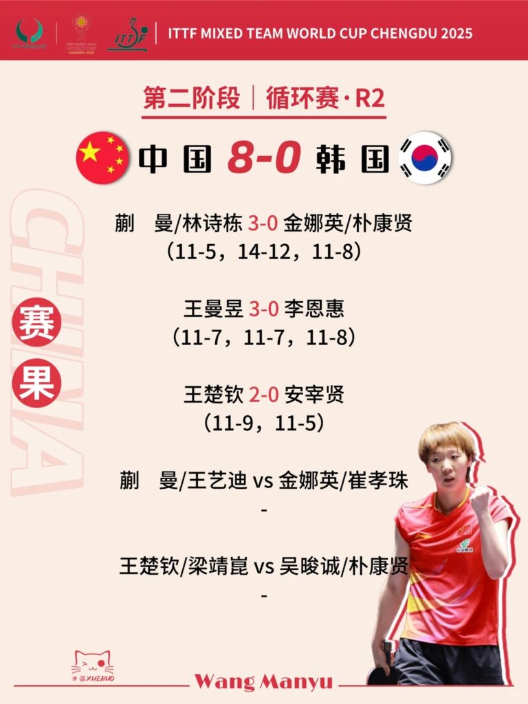 中韩乒乓球队在混团世界杯赛场早已结下深厚渊源,前两届赛事中两队曾连续会师决赛,国乒均以绝对优势夺冠,奠定了心理层面的压制地位。就在本月4日的第二阶段循环赛中,国乒还以8-0的比分横扫韩国队,当时林诗栋/蒯曼的混双组合、王曼昱的女单、王楚钦的男单均未丢一局,展现出压倒性的实力优势。