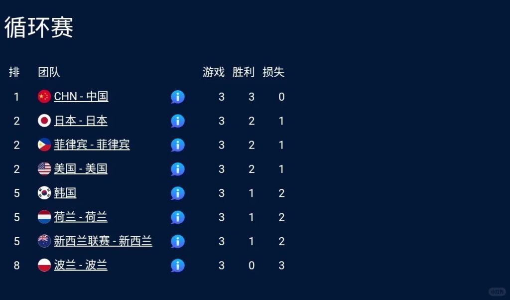 首日对阵实力不俗的美国队,比赛全程胶着,队长徐晓明在第三局最后一击上演精彩的双飞得分,为中国队拿到关键3分,奠定胜利基础,最终以9-8惊险取胜。第三轮与菲律宾队的较量更是焦点中的焦点,两队赛前同为两连胜领跑积分榜,这场对决堪称“榜首之争”。此前双方今年已有两次交手,各胜一场平分秋色,此次再度碰面火药味十足。比赛中中国队打得极为耐心,上半场以3-2领先,下半场成功偷分扩大优势,最终以5-2完胜对手,牢牢占据积分榜第一的位置。目前三轮战罢,日本队、菲律宾队、美国队均为2胜1负紧随其后,中国男队接下来将依次迎战新西兰队、韩国队、波兰队和日本队,每一场对决都关乎晋级命运。