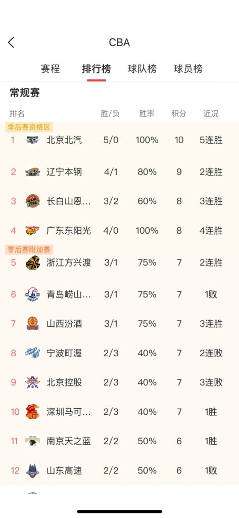 截至 12 月 22 日,常规赛前四轮战罢,北京首钢和广东宏远成为唯一保持不败的两支球队,以 4 胜 0 负的战绩携手领跑积分榜,上演 “双雄争霸” 的精彩戏码。