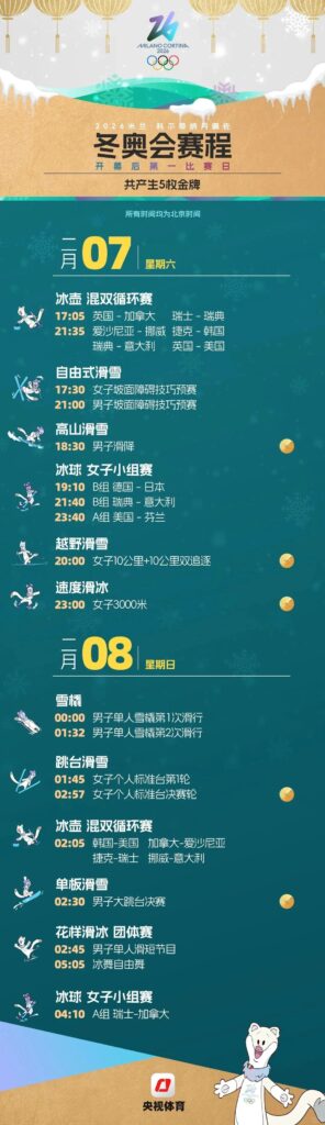 - 2月16-17日 夜间:花样滑冰双人滑(隋文静/韩聪卫冕战)