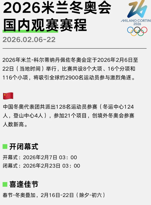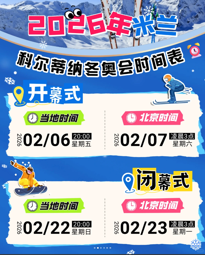 - 开闭幕式亮点:开幕式于 2 月 6 日晚 8 点(北京时间 2 月 7 日凌晨 3 点)在米兰圣西罗体育场举行,这座见证无数足球传奇的场馆将以奥运盛宴完成 “谢幕演出”,赛后将为新球场让路;闭幕式于 2 月 22 日晚 8 点(北京时间 2 月 23 日凌晨 3 点)在维罗纳圆形竞技场举办,近两千年历史的古罗马遗迹将变身奥运舞台,尽显文化与体育的交融。