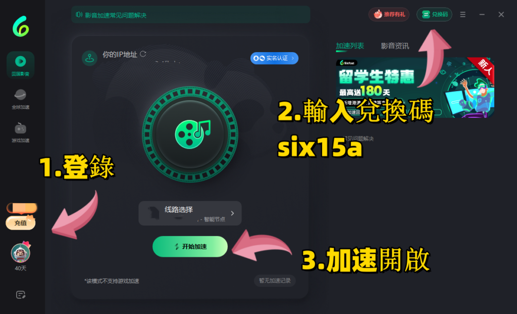进行下载。下载好后按照提示登录注册,在会员中找到【兑换码】,使用【six15a】先领取时长,才能使用软件,也可以直接点击:https://www.sixfast.com/tg-exchange 按照下图所示填写兑换码【six15a】,并按照右边步骤注册登录Sixfast,领取时长。(支持手机和电脑)