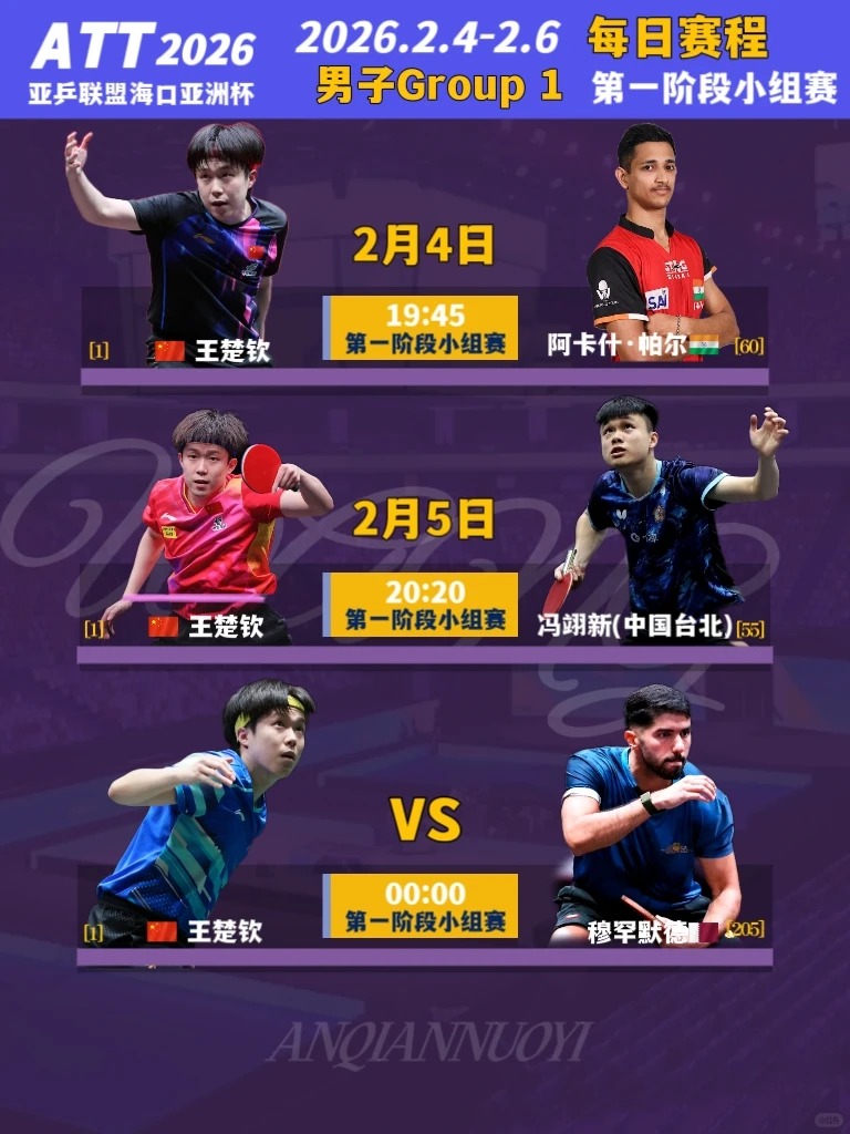 - 重点赛程:2 月 4 日 11:00 T1 孙颖莎 vs 叶伊恬(小组赛首秀)2 月 4 日 19:10 T1 王楚钦 vs 阿里梅斯托夫(小组赛首秀)2 月 7 日 1/8 决赛、1/4 决赛(“魔鬼赛程”,孙颖莎、王楚钦大概率登场)2 月 8 日 半决赛、决赛(冠军争夺战,见证莎头冲冠时刻)