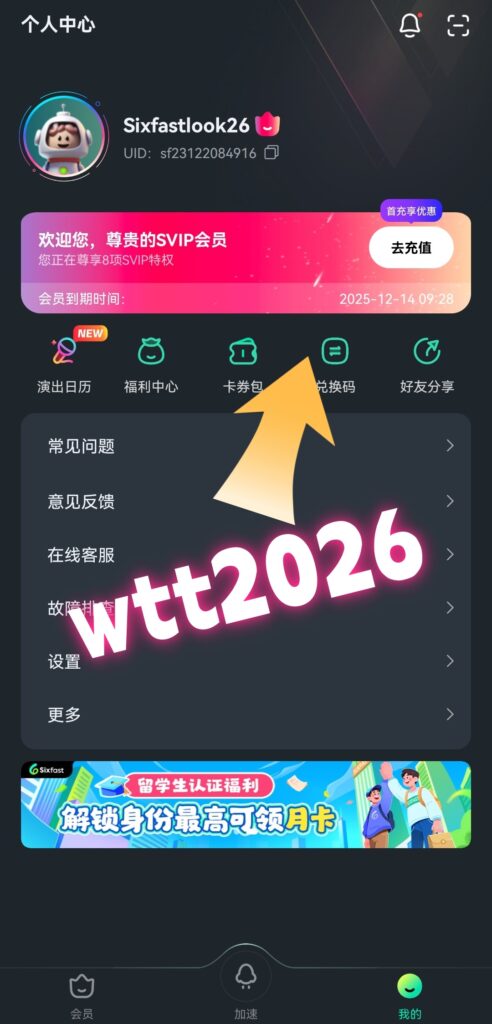 由于在部分海外区域,中文流的现场直播的平台只对中文大陆的地区开放,海外用户没有办法正常观看,那么需要用Sixfast软件来解决,只需要用兑换码wtt2026就能免费使用sixfast