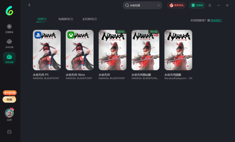 之后在游戏库内搜索永劫无间,然后点击加速,就可以正常解决在海外玩国服的网络问题