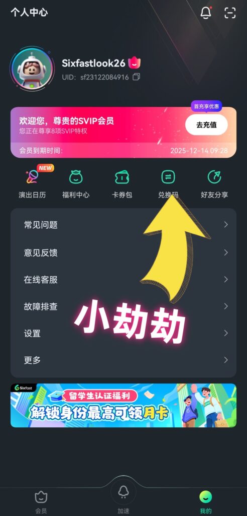 Sixfast应用下载注册后右上角找到兑换码,输入【小劫劫】就能获得72小时使用时间,记得先兑换才能正常使用