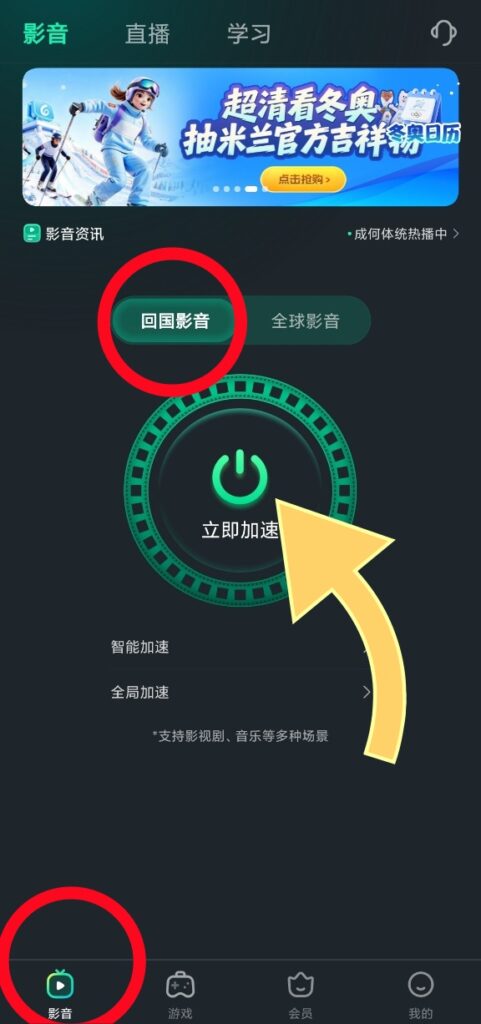 ②兑换完之后,才可以到下方找到【影音】,点击加速,重新打开红果短剧即可观看!
