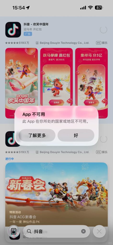 近期大量留美华人、留学生反馈:打开 App Store 更新抖音、剪映等常用 APP 时,弹出 “此应用在你所处的国家或地区不可用” 提示;即便已安装的 APP,也长期无法收到版本更新,部分功能甚至出现卡顿、失效。这并非偶然故障,而是受美国政策禁令与平台合规调整的双重影响,截至 2025 年 1 月,已有 11 款字节系应用被苹果美区商店下架,包括抖音、TikTok、剪映、飞书等核心产品。
