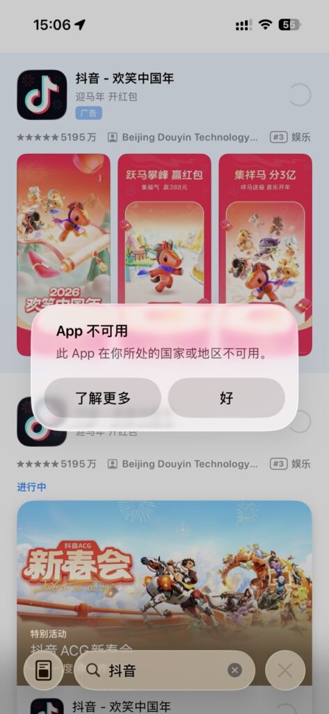 2月4日之后,在美国的留学生发现,想把抖音更新到最新版本的欢笑中国年,却提示“不再提供抖音-欢笑中国年”,下载不了,也更新不了,只能用旧版本的抖音,现在好了,想用抖音看个春晚都看不了