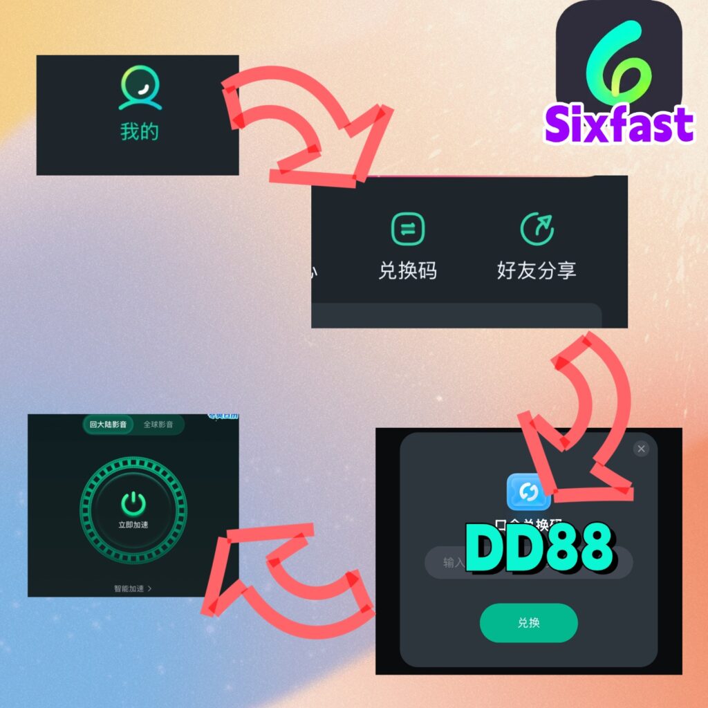 2、下载好后按照提示登录注册,在会员中找到【兑换码】,使用【887】先领取时长,才能使用软件,也可以直接点击:https://www.sixfast.com/tg-exchange 按照下图所示填写兑换码【887】,并按照右边步骤注册登录Sixfast,领取时长。