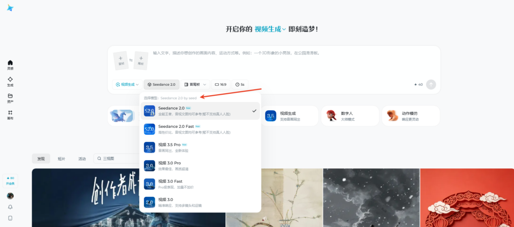 - 登录后,找到“AI视频生成”板块,点击进入,即可看到Seedance2.0模型入口,点击切换即可解锁(灰度测试期间,加速后可直接显示入口,无需额外操作)