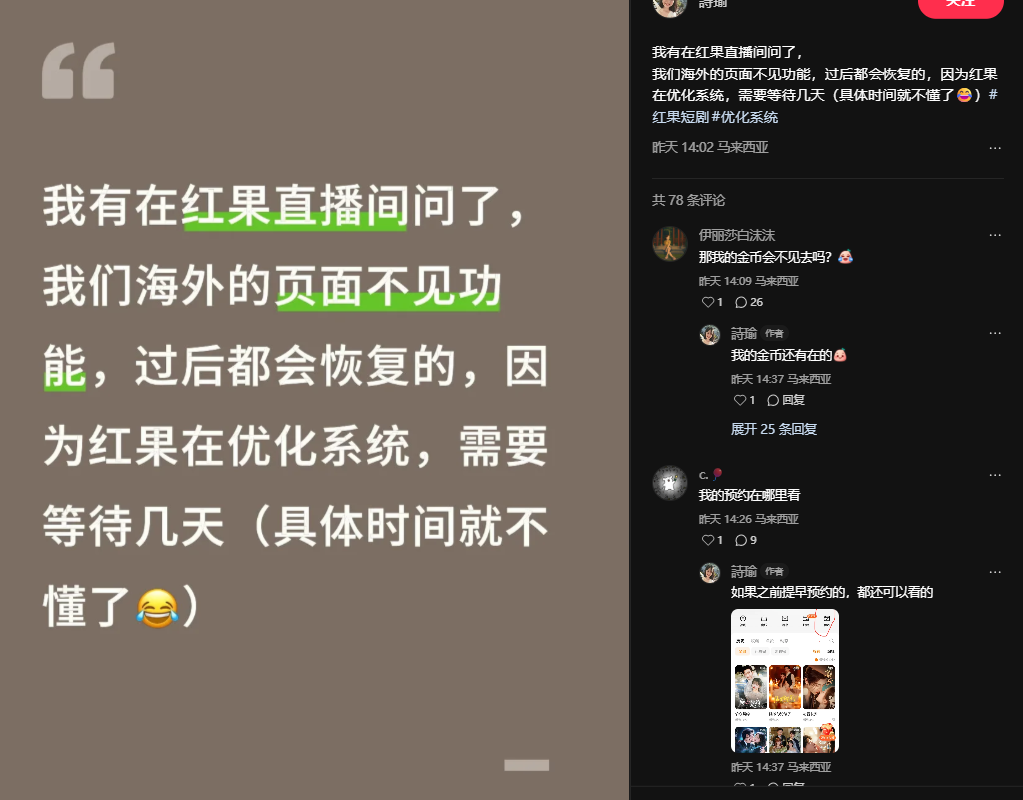 • 衍生功能受限:部分用户反馈,除了评论和弹幕,漫剧板块、活动入口也会同步消失,甚至金币资产无法正常显示