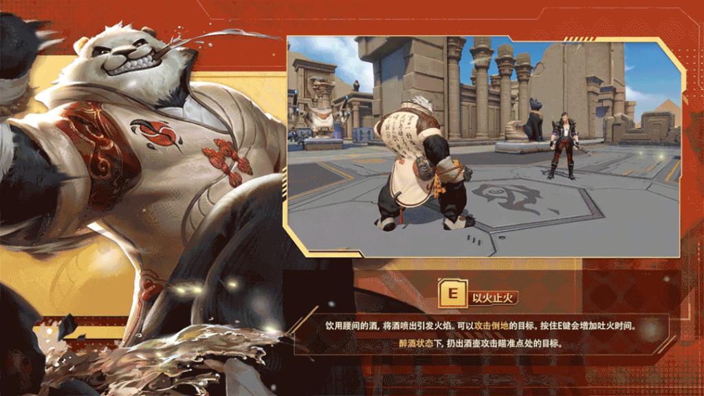 引用腰间的酒,将酒喷出引发火焰。可以攻击倒地的目标。按住E键会增加吐火时间。醉酒状态下,扔出酒壶攻击瞄准点处目标。按住E键可以增加吐火时间,是吉祥主要的输出和补伤害技能。