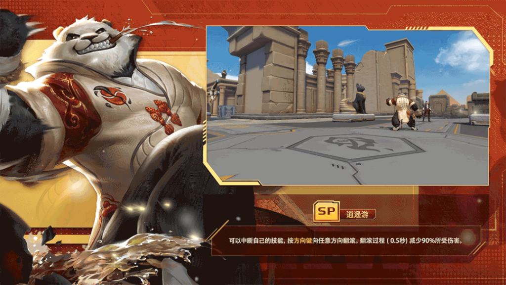 可以中断自己的技能,按方向键向任意方向翻滚,翻滚过程(0.5s)减少90%所受伤害。专属SP技能可以在任何时候中断自身动作使用,但却不能受击时使用,所以需要一定的预判,但CD也比普通翻滚短一些。