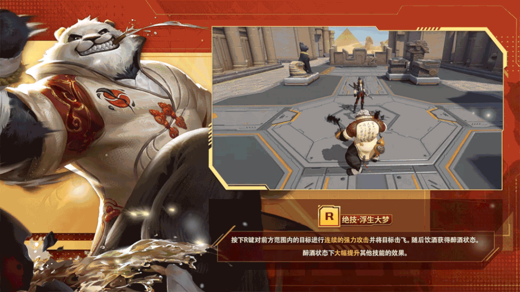 对前方范围的目标进行连续的强力攻击并在将目标击飞。随后饮酒获得醉酒状态。醉酒状态下将大幅提升其他技能效果。此技能十分注重时机,在团战中吉祥一般如开头所说,灵活骚扰,保护后排。找好时机R技能起手打入团战,获得醉酒状态,再衔接右键击飞,并用E、Q、F追击,收割人头轻轻松松。
