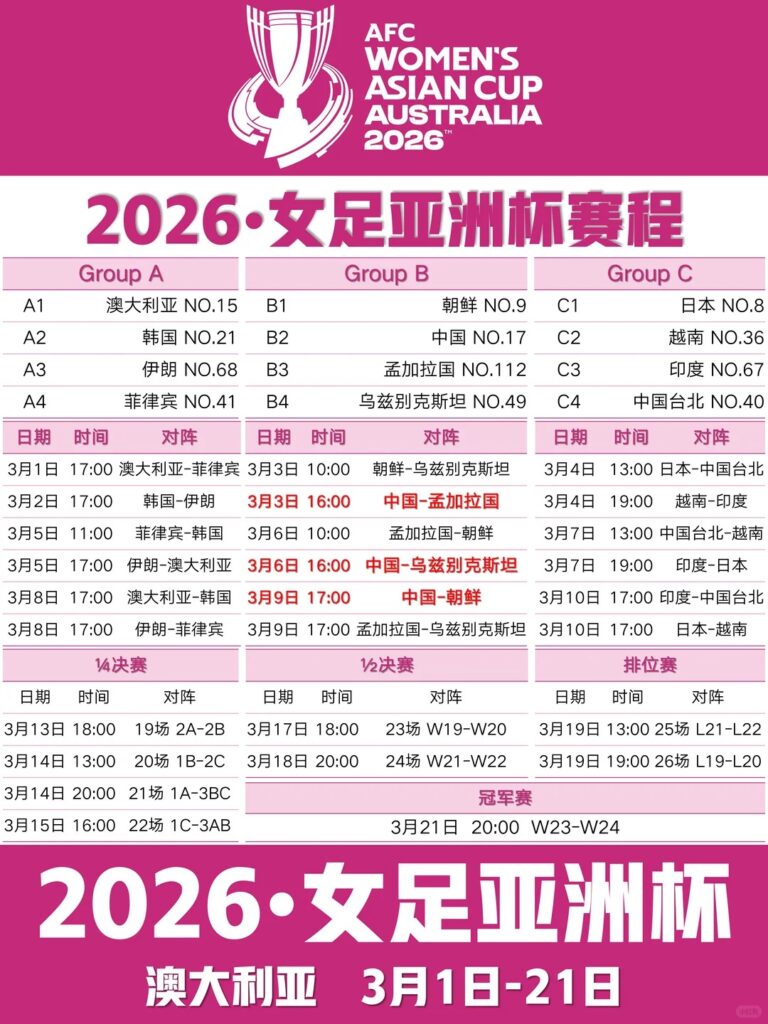 本次女足亚洲杯赛程密集,中国女足小组赛、淘汰赛全程高能,以下是重点场次(均为北京时间,精准无误差),不管是海外哪个时区,都能提前定好闹钟,不错过每一场精彩对决: