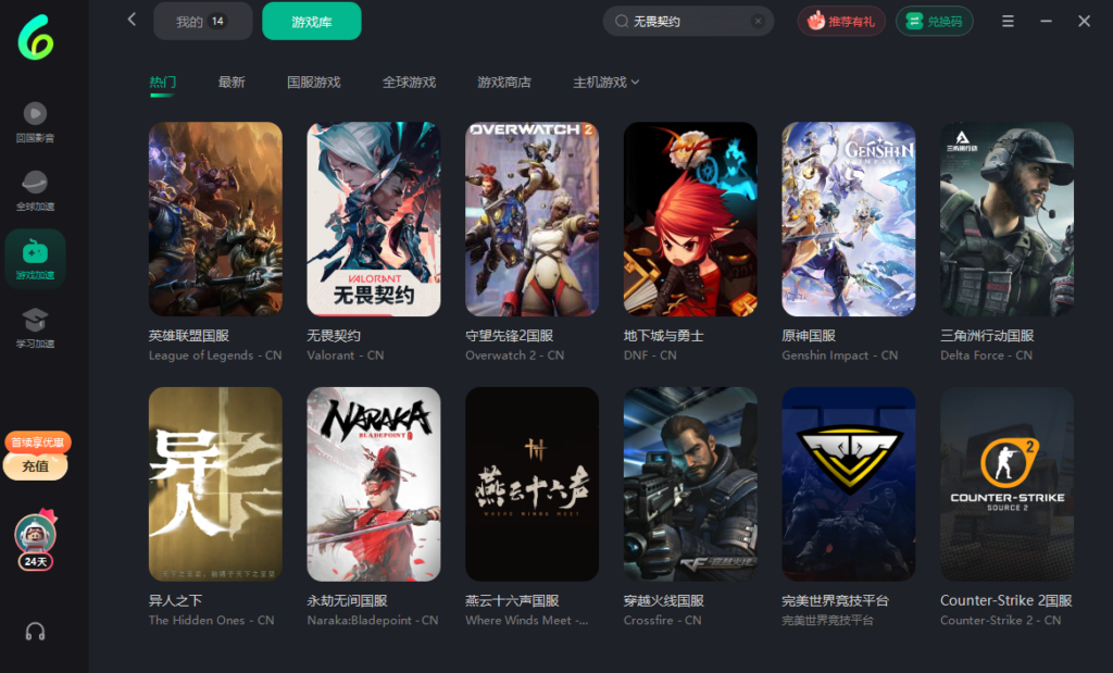 • 游戏:王者荣耀、和平精英、原神国服、鸣潮、DNF、LOL 国服等
