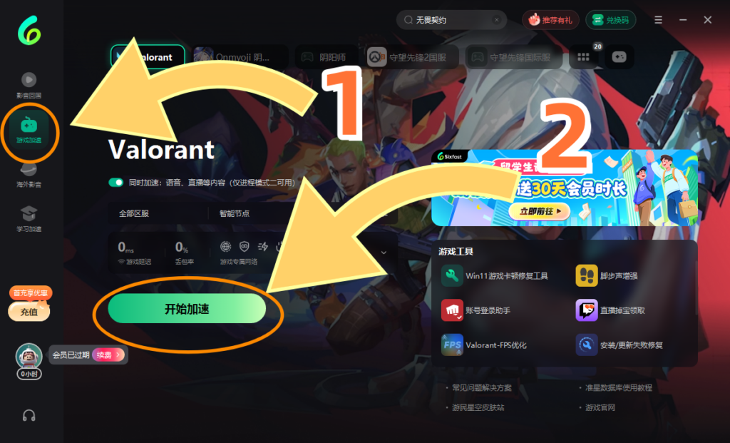 记得先兑换然后在左边找到【游戏加速】-点击【开始加速】找到福州节点,加速完成,开启永恒之塔2