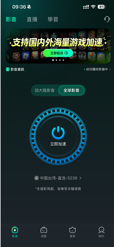 ④找到全球影音功能,选择一条支持Gemini的线路,点击【立即加速】
