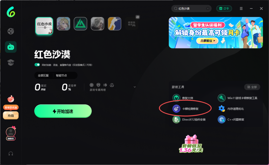 第四步:记得先兑换然后再左边找到【游戏加速】-上方搜索栏【红色沙漠】-点击【开始加速】