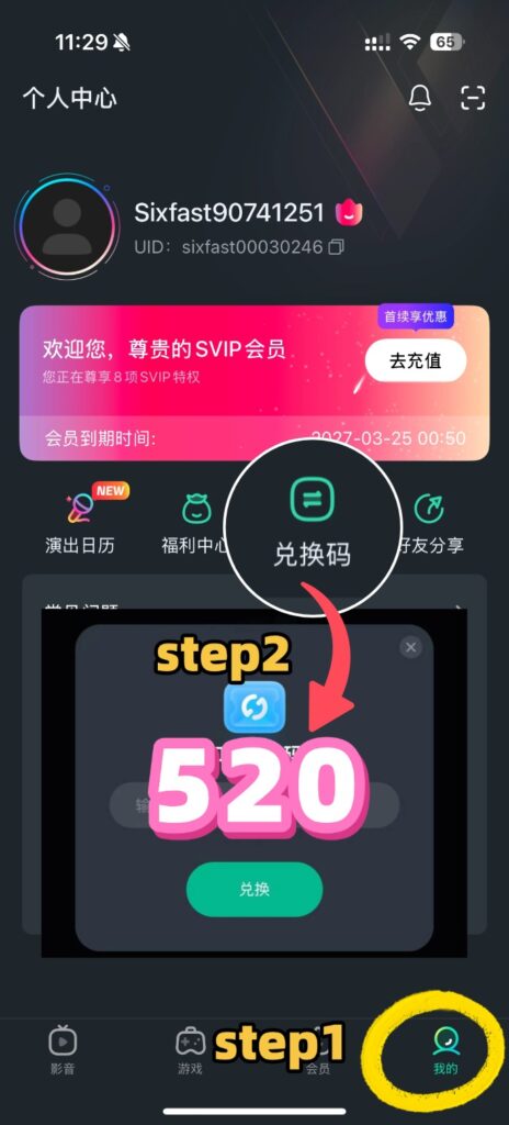 ①在界面找到【我的】–【兑换码】-输入【520】-即可领取免费时长!