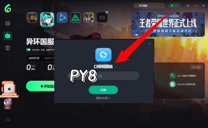 2.打开sixfast后,在客户端右上角找到【兑换码】,输入“PY8”领取免费加速时长,右上角搜索《异环》,点击加速,选一个适合你所在海外地区的国内专线,点一下启动优化(专门为预下载场景调好的);
