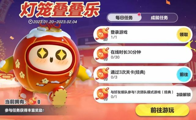 灯笼叠叠乐活动开启啦!活动期间完成任务收集小灯笼,可在兑换商店中兑换,内含各种字型的灯笼外观。