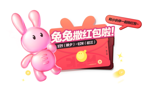 新年到~红包雨也来啦!除夕至初三,红包兔将于指定时段到蛋仔岛上撒红包,每天8场红包雨,奖品丰富,详情可于除夕当日进入游戏了解~