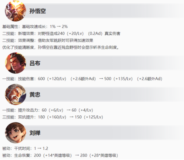 其中孙悟空和刘禅喜提加强,强势的黄忠、海月等英雄获削弱。