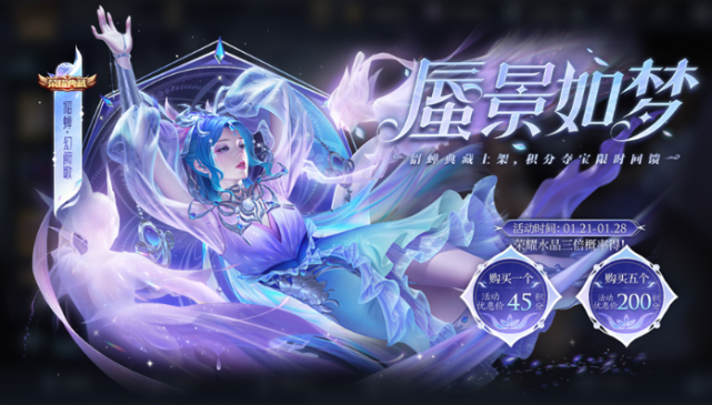 积分夺宝和魔法球将在1月21日~1月28日开启折扣活动,其中积分夺宝抽中荣耀水晶的概率提升3倍。