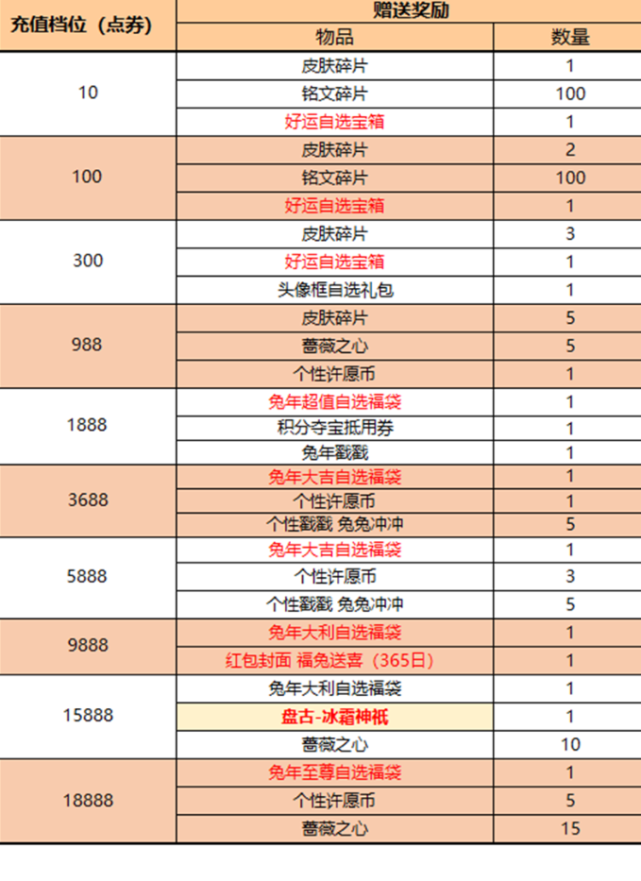 15888点券的档位送盘古冰雪主题的史诗限定皮肤和10个蔷薇之心。