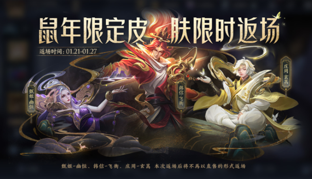 甄姬-幽恒、韩信-飞衡、庄周-玄嵩三款皮肤返场,限时1月21日0:00-1月27日23:59,本次返场后将不再以直售形式返场,888点券一款