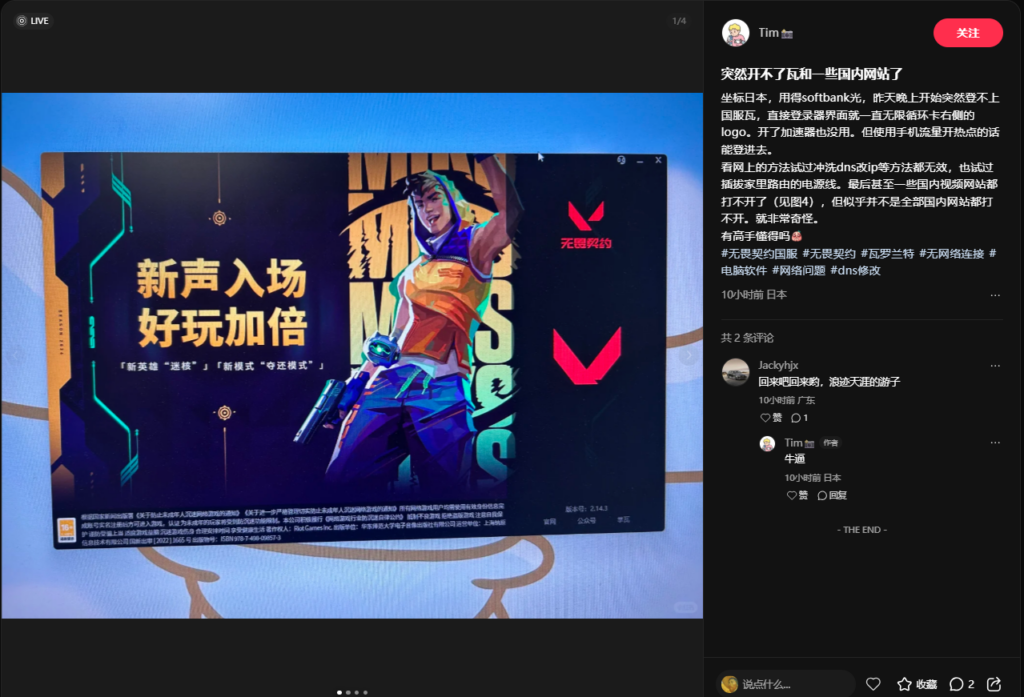 坐标日本,使用SoftBank网络的玩家最近集体遇到诡异状况:昨天晚上开始,无畏契约(瓦罗兰特)国服登录器界面一直无限转圈,右侧logo无法加载,尝试冲洗DNS、改IP等多种方法均无效,家里路由器的网线插拔也没改善。更奇怪的是,其他一些国内网站也无法打开,但并非全部国内网站都打不开,而切换到手机流量热点后却能正常登录。这到底是什么原因?又该如何解决?本文结合实测案例,给出一套可直接落地的“零重启”解决方案。
