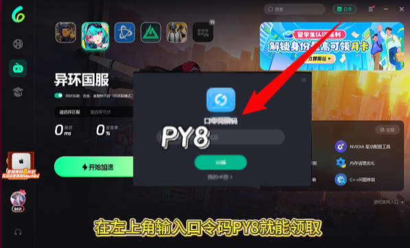 - 打开 Sixfast,在客户端右上角找到【兑换码】,输入“PY8”领取免费加速时长。