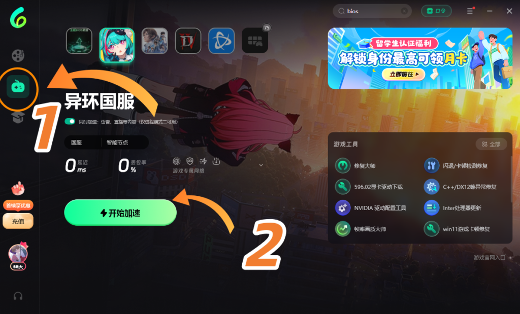 ②兑换完之后,才可以到下方找到【游戏】,搜索“异环国服”,点击加速,加速到国内,就可以正常玩啦