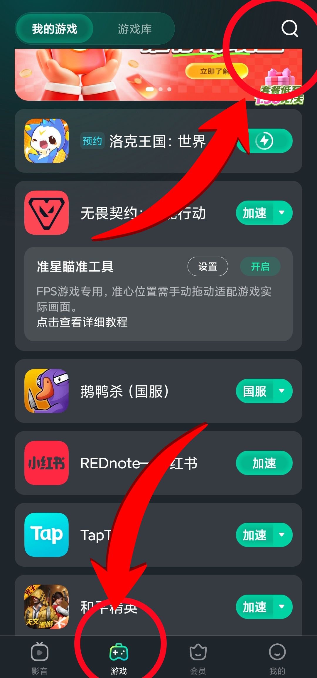 ②兑换完之后,才可以到下方找到【游戏】,右上角搜索王者荣耀,点击加速即可!
