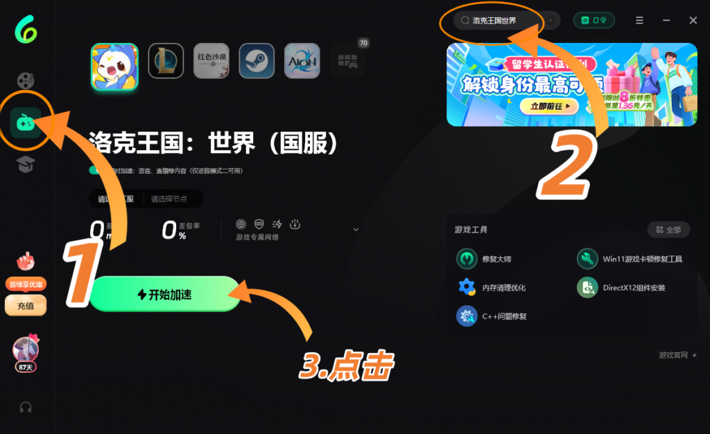 右上角【口令】-输入【231】-领取免费时长!兑换完成后才可以加速!!!